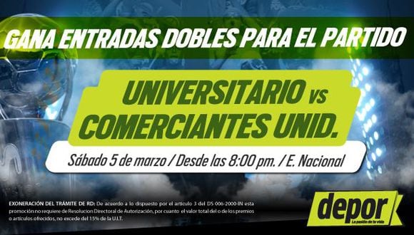 Universitario de Deportes y Comerciantes Unidos protagonizarán uno de los partidos de la séptima fecha del Torneo Apertura. Y como ya es costumbre, Depor te juega las entradas para que tú y un acompañante asistan gratis al estadio Nacional.