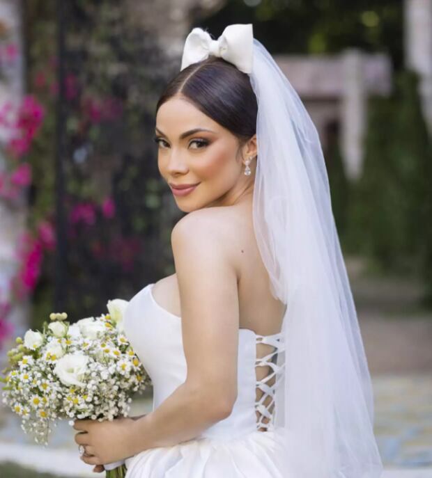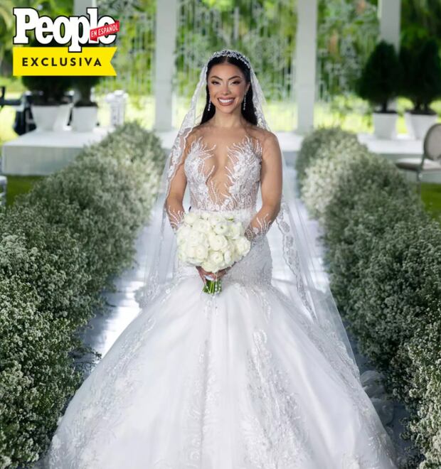 Otro aspecto que llamó la atención en redes sociales fue el velo de la novia. Para algunos fue exageradamente largo pero la propia diseñadora explica el arduo trabajo que tuvieron que realizar al momento del bordado. ”Fue bastante largo, tipo mantilla con encaje bordado a mano y rematado en perlas y cristales”, aseveró Suzelle Taveras, la encargada del traje de la hoy esposa.