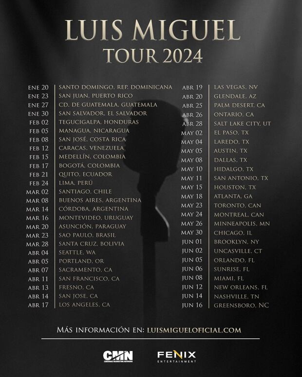 Luis Miguel publicó las nuevas fechas para su gira en 2024 en el continente americano. Tras el rotundo éxito de la gira ‘Luis Miguel Tour 2023′, el cantante compartió en redes que expandirá su recorrido, incluyendo países como Colombia, Perú, Uruguay, Brasil y Estados Unidos. En EE.UU. se prevé una mayor cantidad de fanáticos, debido a la gran cantidad de latinos.